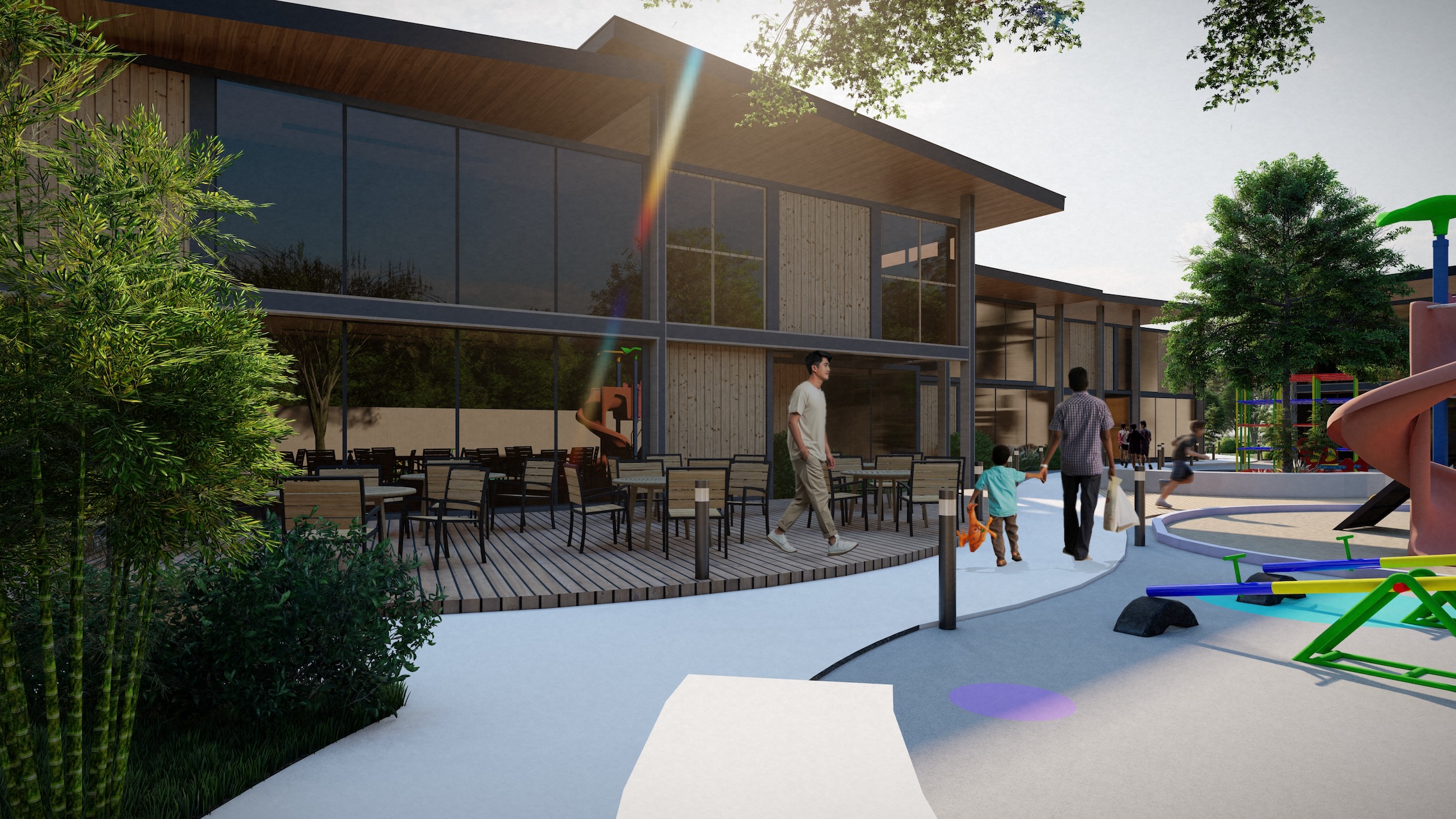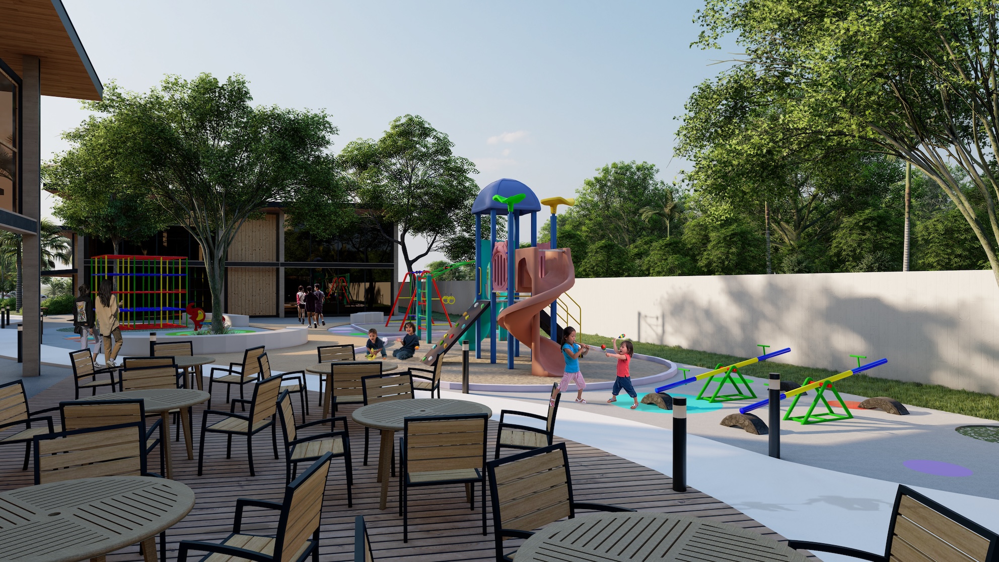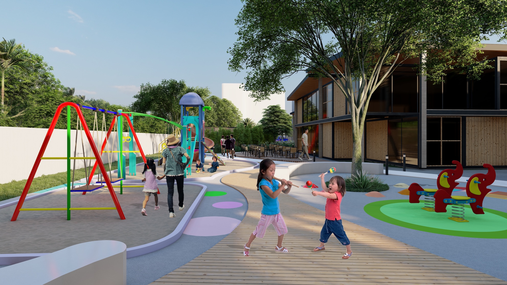 All paths lead to a place for children: the commercial areas and main garden converge at a space for play, conveniently accessible and visible from active areas within the dining and commercial zones.